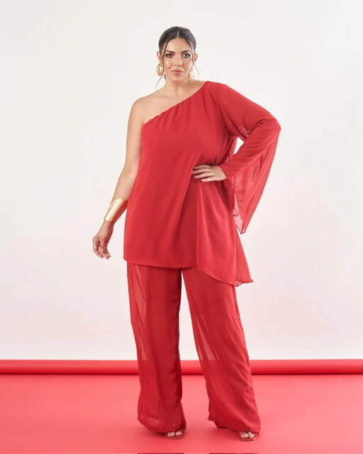 Blusa em crepe alongada um ombro só com elástico no decote, recorte assimétrico na barra e manga flare. Possui forro.