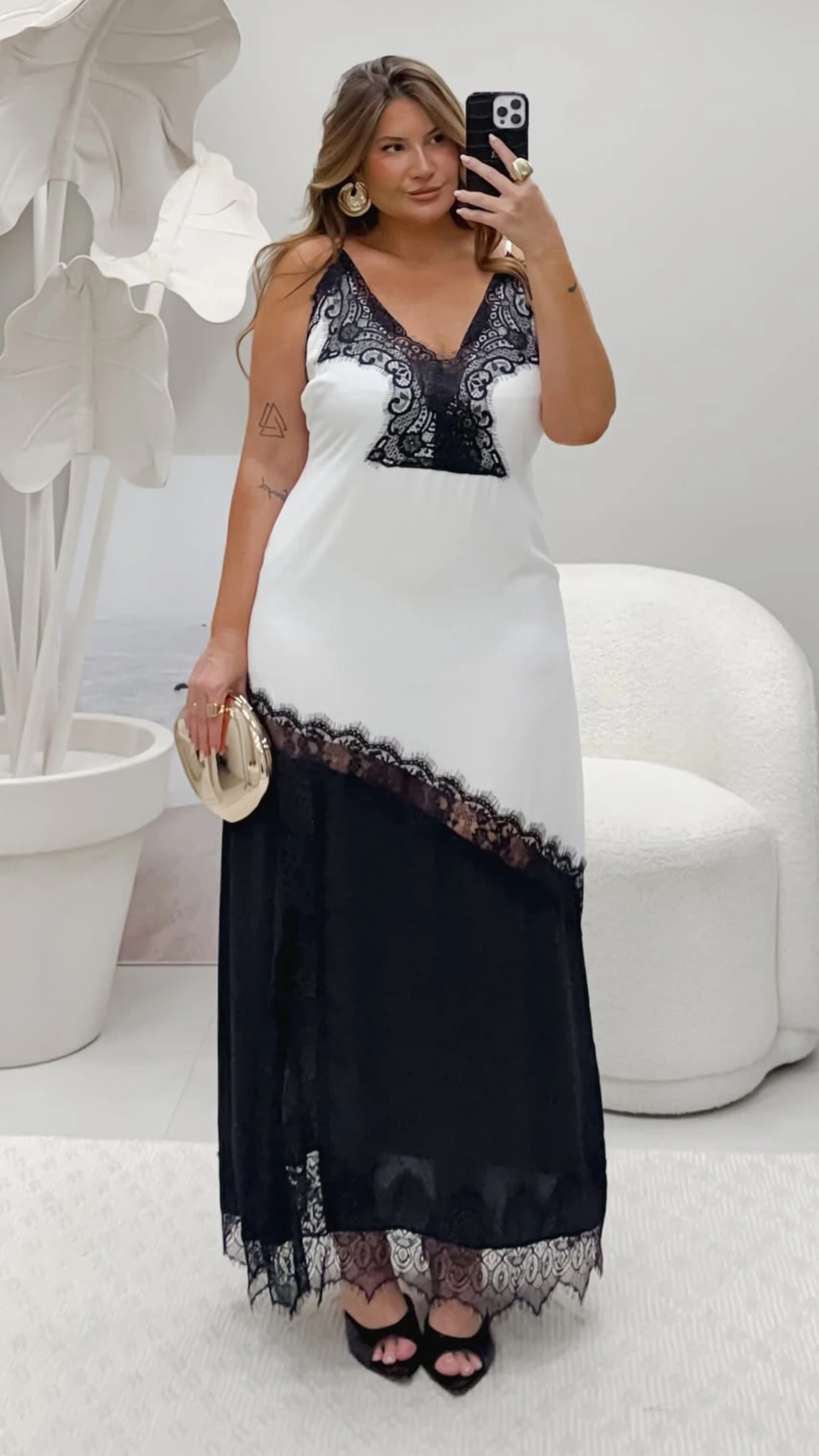 vestido longo com manga babado e cut out abaixo do busto quebela