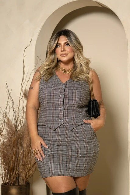 pre venda conjunto alfaiataria tweed xadrez colete e saia milan