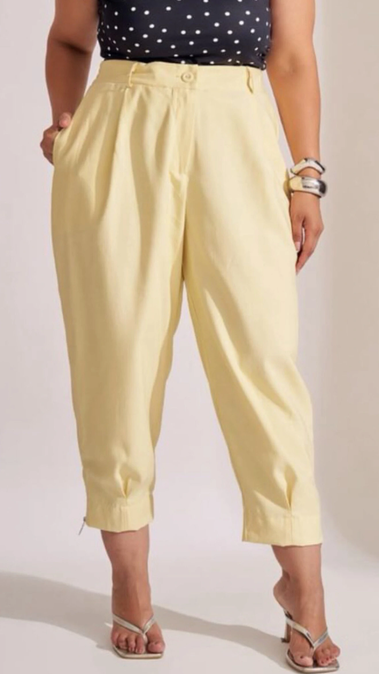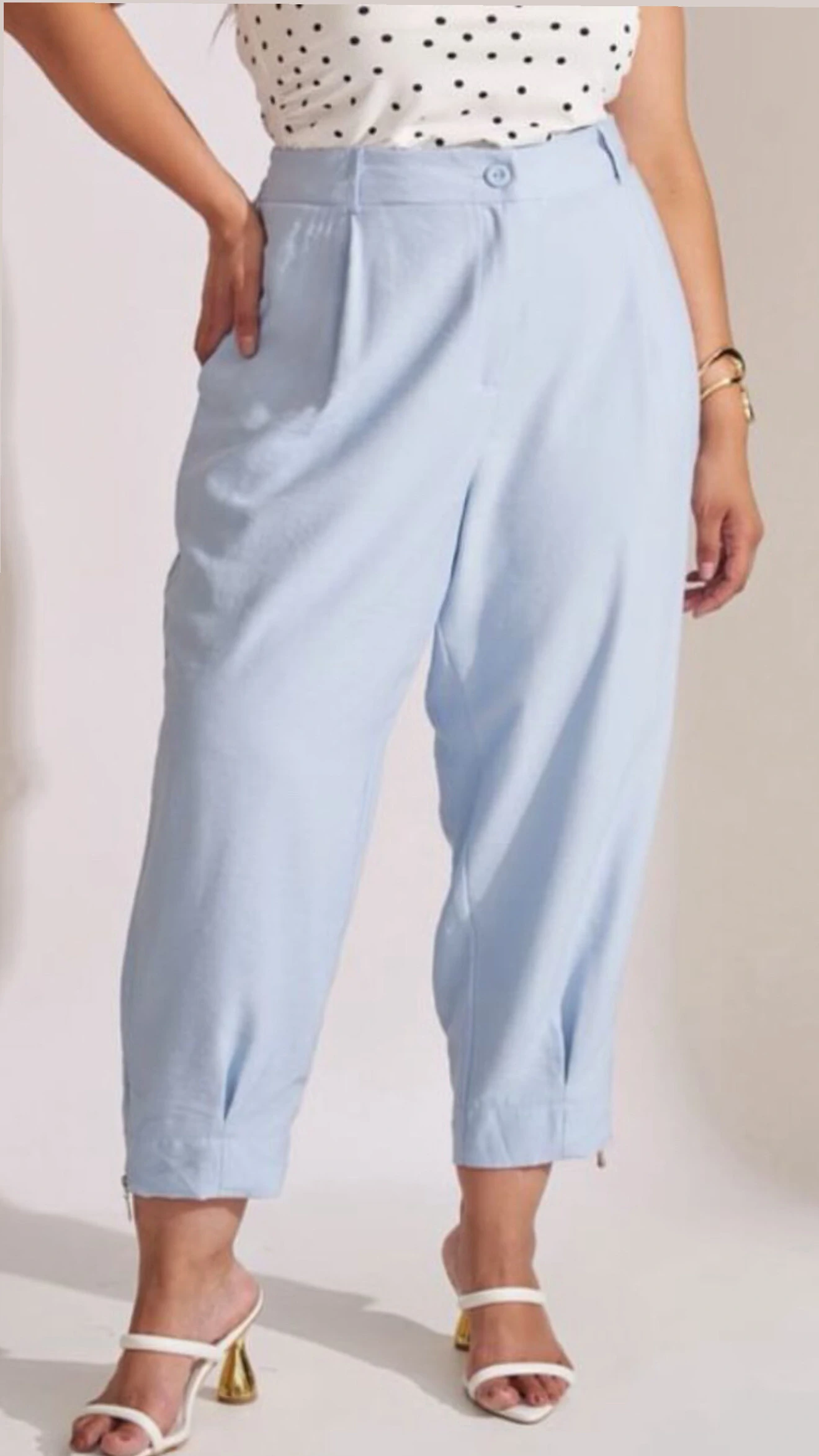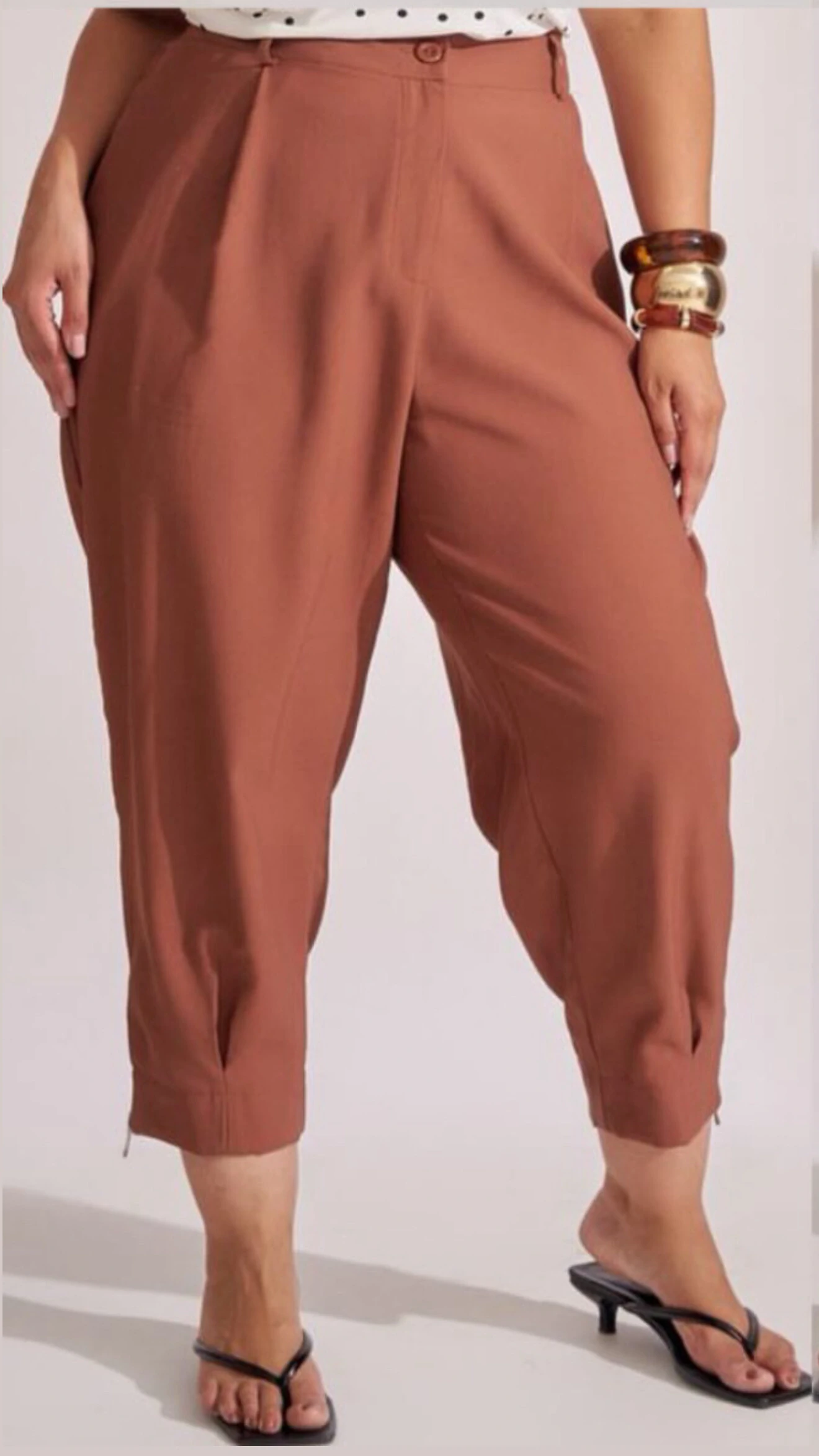 calca em alfaiataria estilo cenoura,com pregas frontais,possui passantes,botao tingido ,ziper frontal e na barra